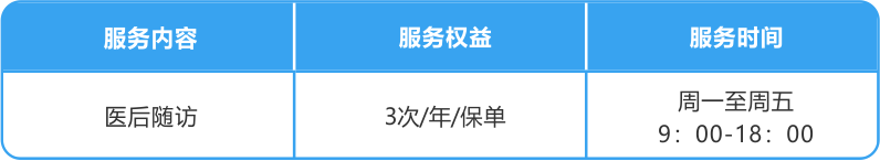 為符合一定服務(wù)條件的客戶提供醫(yī)后隨訪服務(wù),使用醫(yī)后隨訪服務(wù),需滿足針對同一疾病已對應(yīng)申請前述門診預約、住院協(xié)調(diào)、手術(shù)協(xié)調(diào)、國內(nèi)專家咨詢中至少一項服務(wù)。
